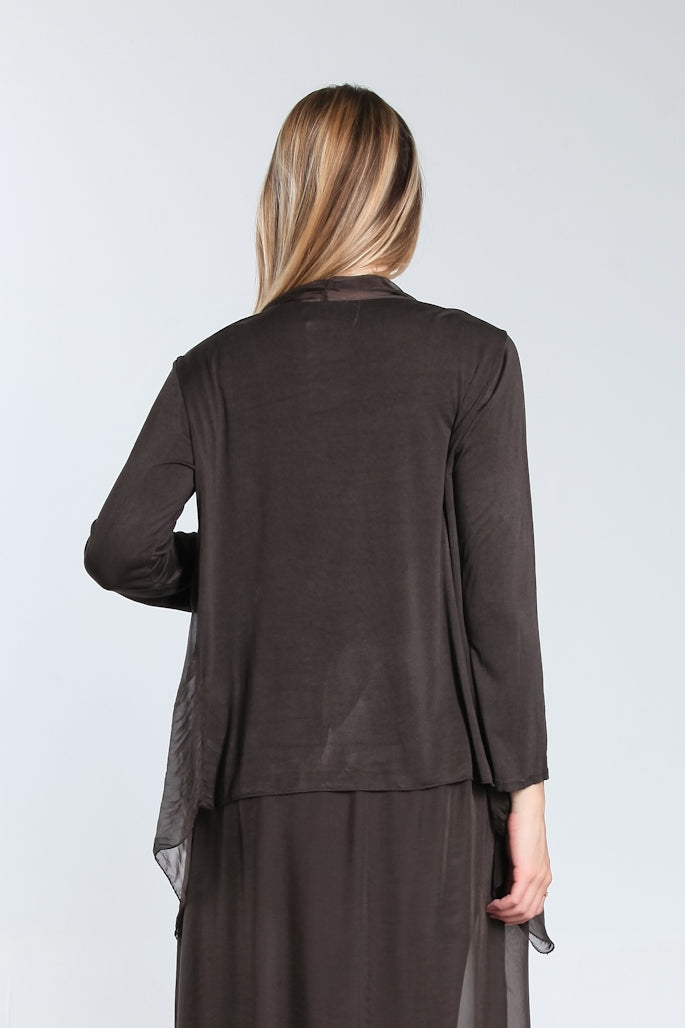 Our Ansley tie cardigan is the perfect topper over everything! The silk panel in front drapes down when left open or creates a flounce when tied. The buttery Viscose sleeves and back, are so comfy, you’ll never want to take her off! A perfect pairing over any sleeveless top or dress when you need a little coverage. Made in Italy.
